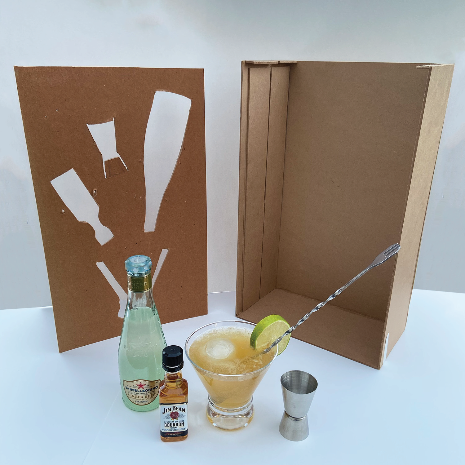 Above are the flat designs of the exterior and interior of the package box. This includes the front panel of the exterior being seen as a translucent acrylic type material and a drink recipe instert in the interior.