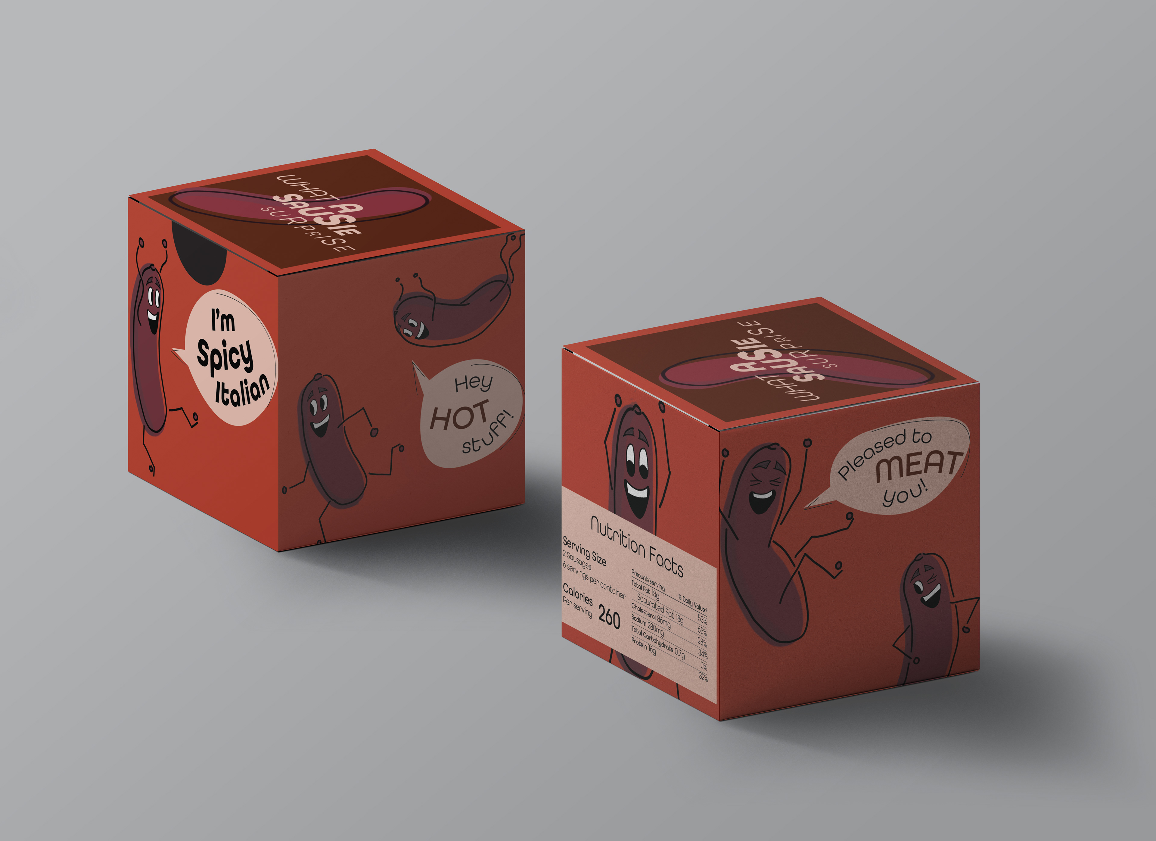 What a Sausie Surprise is a hypothetical package design for a sausage product line. The hand drawn, fun dancing sausage characters keep a lively and and upbeat image to the packaging and the characters different "sausie" phrases that relate to the flavoring of each box will make you smile. Browse below to see the different box mockups and flat designs of each of the sausage flavors.